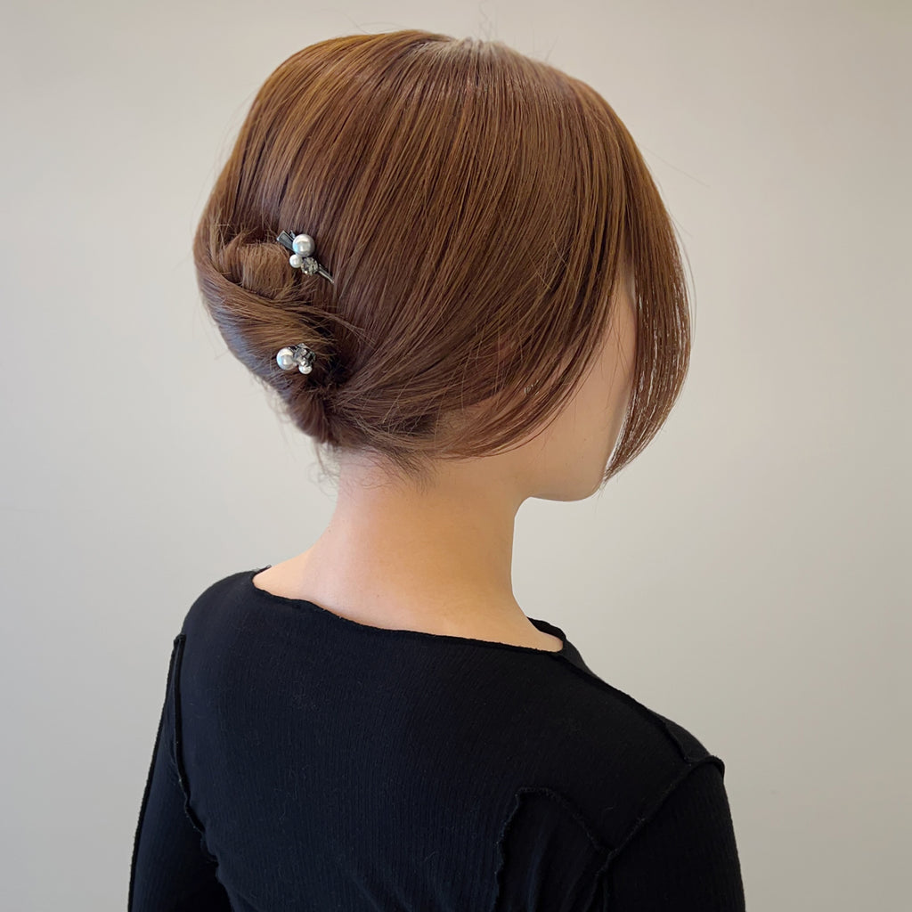 グレー・白2色のパールと一粒のクリスタルガラスがキラリと光り、モノトーンでありながらも控えめな華やぎを感じさせます。ヘマタイトカラーの地金は主張しすぎず、他のヘアアクセサリーやジュエリーとのコーディネイトが組みやすいのもポイント。同シリーズのUヘアピンやボビーピンとお揃いでコーディネイトするのも素敵です。