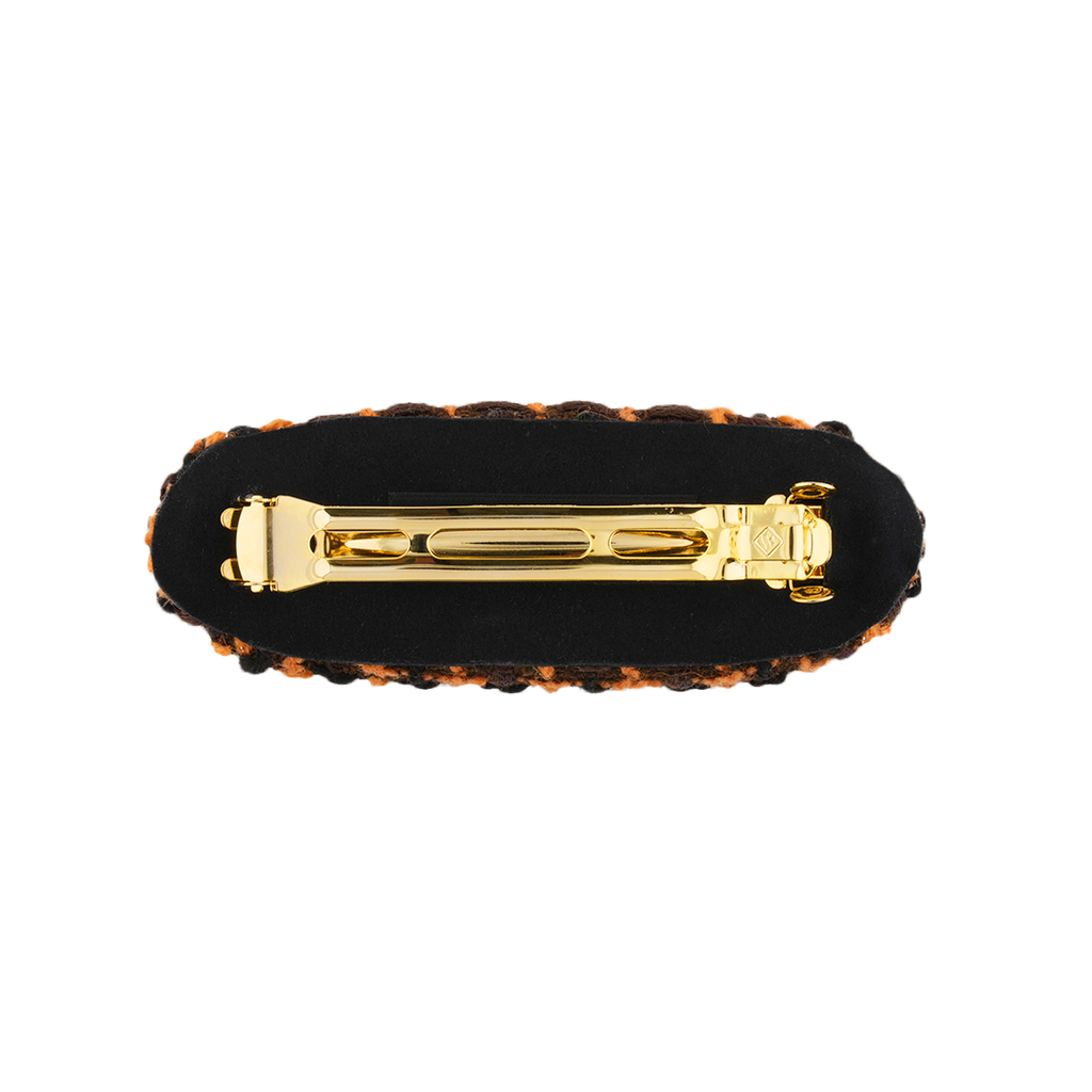 THBTオリジナル、英国リントンツイード社のテキスタイルを使用したオーバルバレッタ。異なる色や質感の糸が織りなす複雑なテクスチャーが季節の装いを小粋に演出します。パデッドタイプのふっくらとしたフォルムは存在感抜群。ときにクラシカル、ときにモードにと、着ける人の個性を引き立たせ、スタイルを印象付けます。ボリューム感の割に軽量で着けやすいのもポイント。容量大きめの10㎝金具を使用し、毛量が普通~少なめの方はこれ一つでポニーテールが留まるサイズ感です。