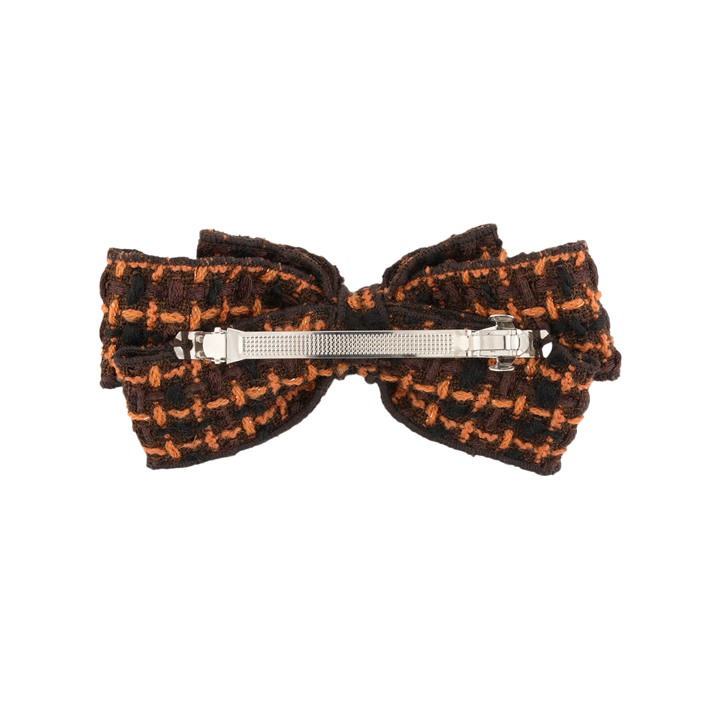 THBTオリジナル、英国リントンツイード社のテキスタイルを使用したトリプル ボウバレッタ。異なる色や質感の糸が織りなす複雑なテクスチャーが季節の装いを小粋に演出します。三層に重なったリボンは大人仕様の贅沢なデザイン。正統派のハーフアップやポニーテール、シニヨンに添えてヴィンテージシックに楽しんだり、またワークブーツやライダースなどで英国ストリート風にMixしたりなど、着こなし次第でさまざまに表情を変え、おしゃれ心を刺激する一品です。