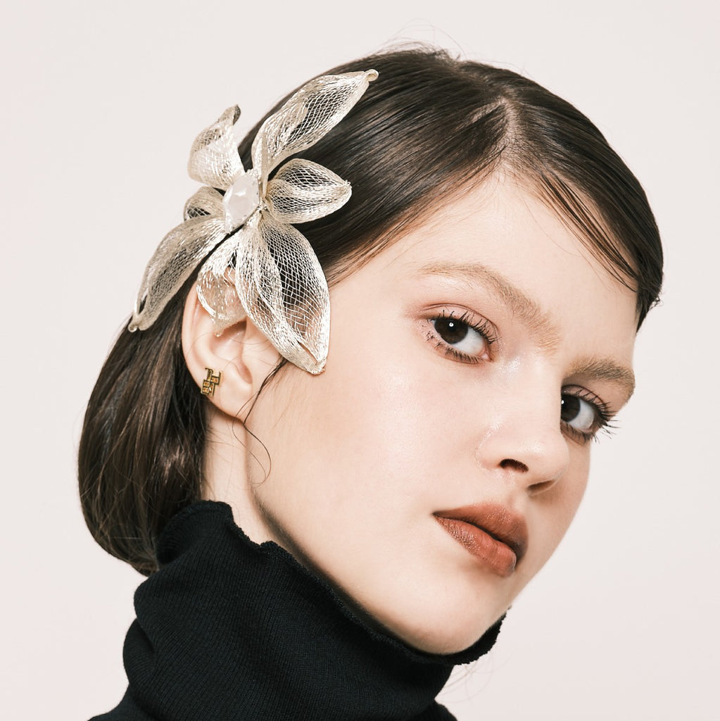 レーシーな細身の花びらが規則正しく並び、華やかさの中にどこか凛とした美しさを漂わせています。センターにあしらった大粒のポリゴンカットのクリスタルガラスも、クールな輝きがひときわ印象的。ともすると甘くなりがちなフラワーモチーフを知的かつスタイリッシュに洗練させています。