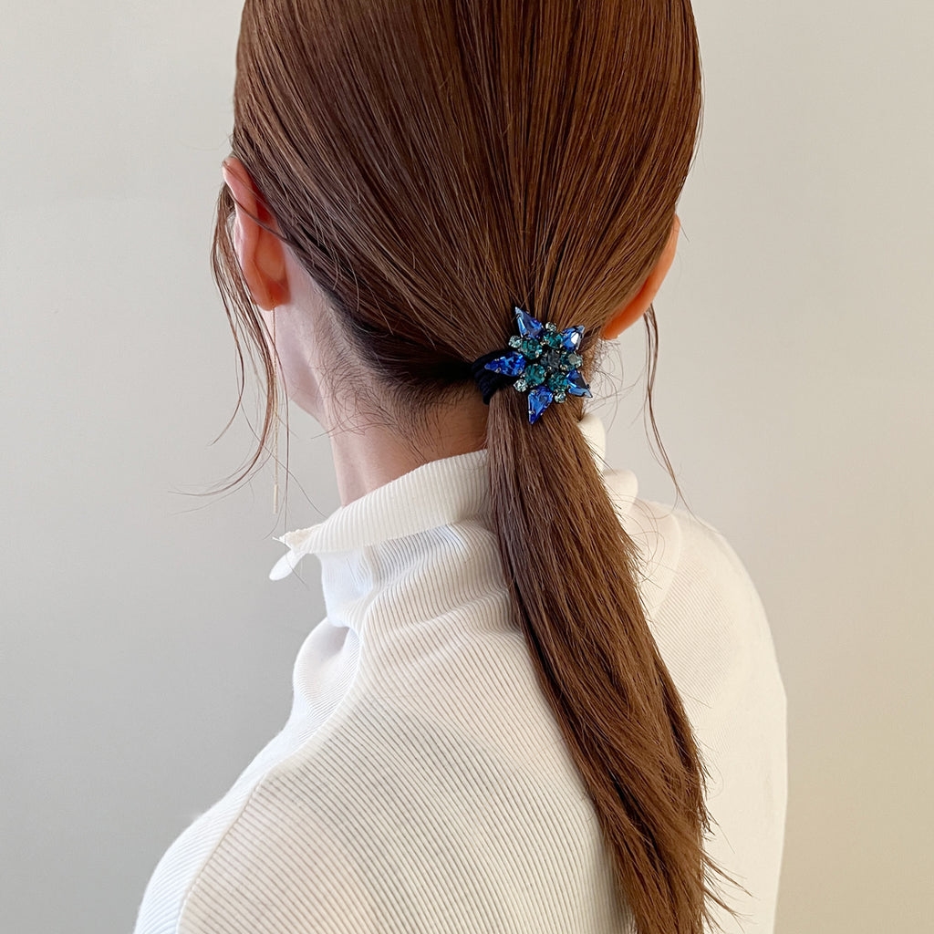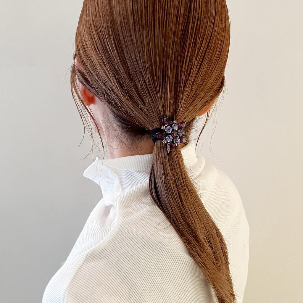 色とりどりのクリスタルガラスで星のきらめきを表現したコレットマルーフのポニーに2025 fallカラーが登場。エッジ感のあるフォルムを計算された配色のクリスタルガラスが引き立て、他にはない存在感を放ちます。ヘマタイトカラーの地金をベースに、落ち着いたトーンの組み合わせが秋冬のコーディネイトをシックに彩ります。ポニーテールやシニヨンなどのベーシックアレンジはもちろん、ブレスレット感覚で手首につけるのもおすすめ。ひと目で心を惹きつける印象的なデザインはご褒美やギフトにも最適です。