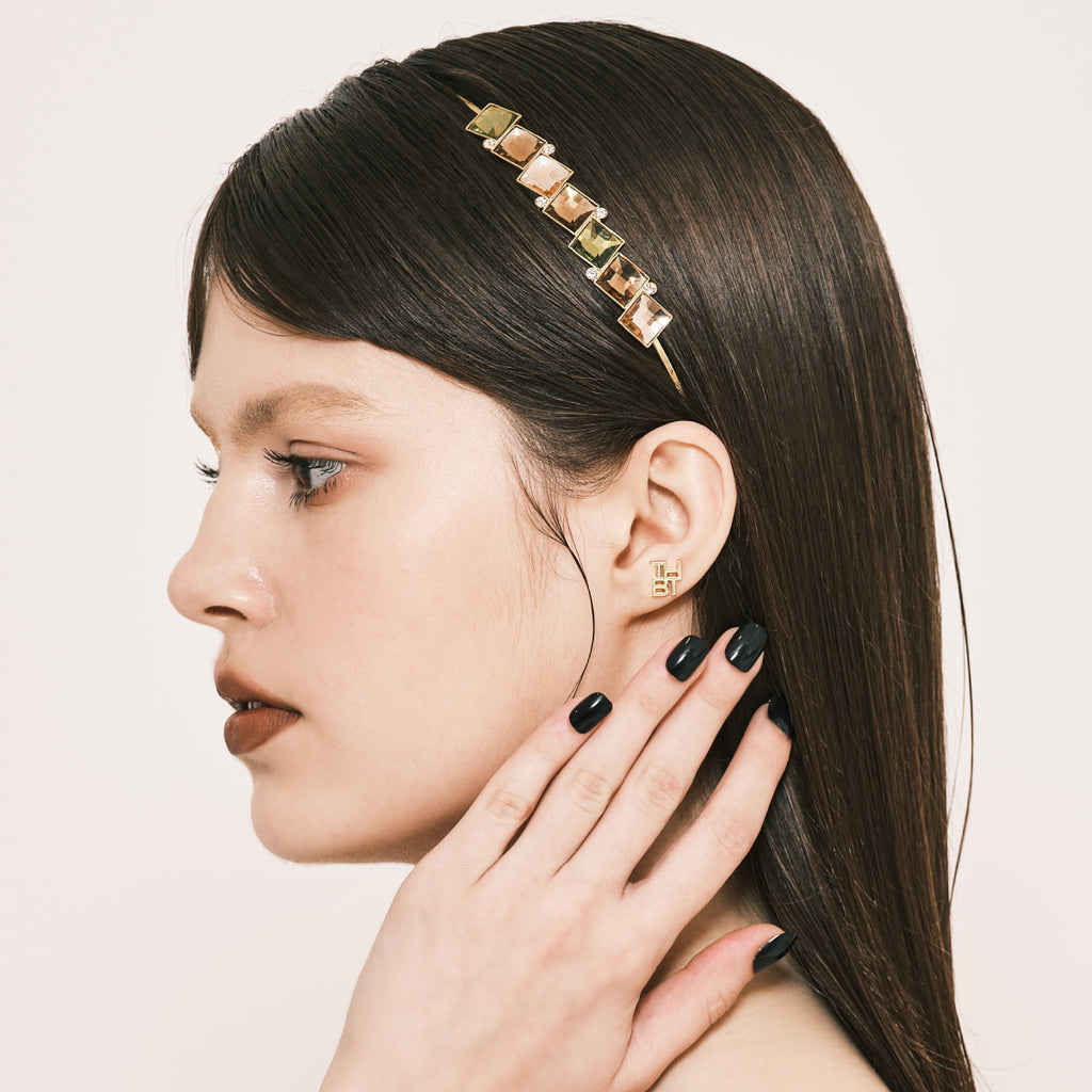 スクエアのクリスタルガラスをフィーチャーしたコレットマルーフの新作ヘッドバンド。