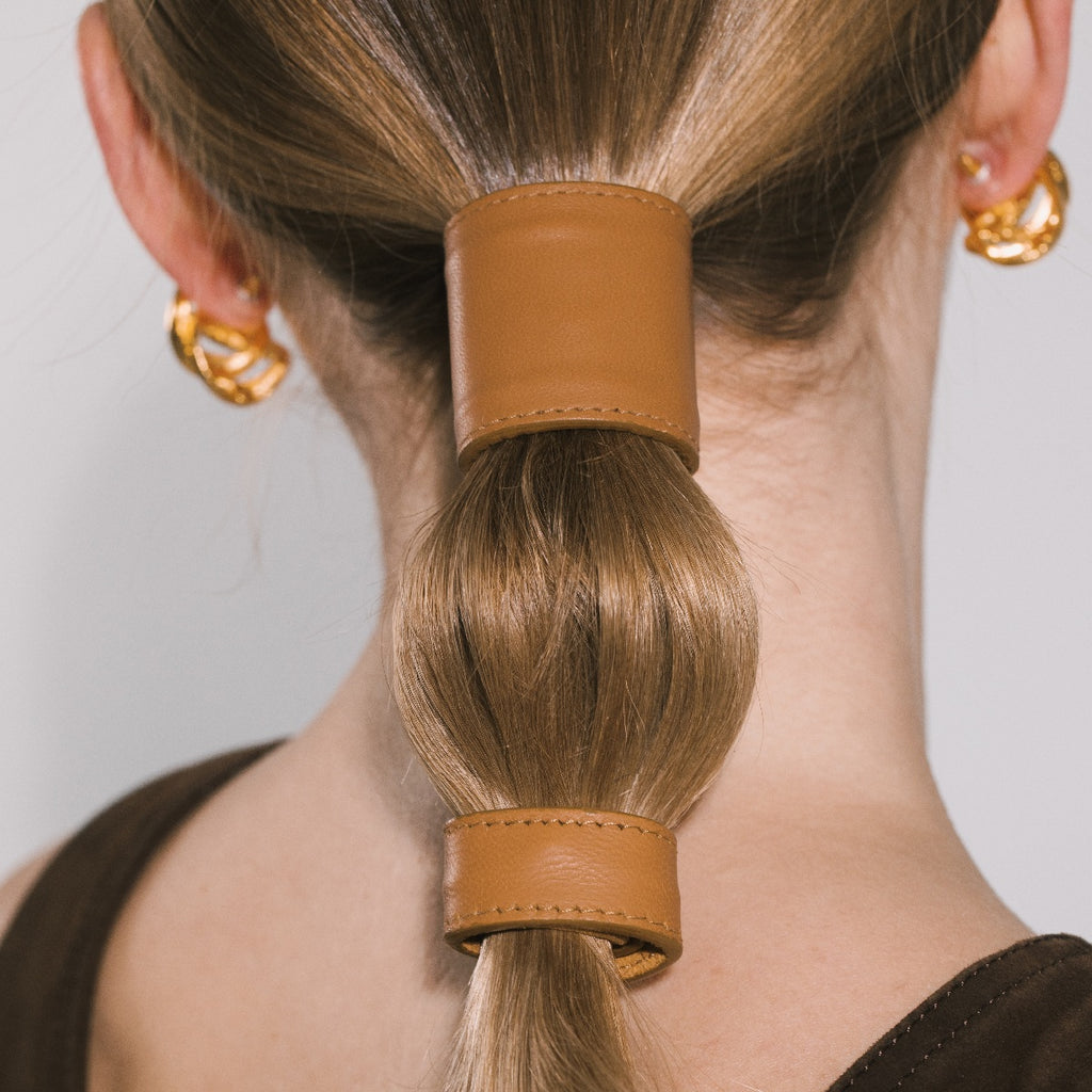 柔らかなラムスキンを使用したジェニファーベアのポニーラップ。革本来のテクスチャーを活かした仕上がりが上品な印象です。内側には可塑性のあるワイヤー芯が2本縫い込まれており、毛量に合わせてカーブを調整することができます。幅広のカフポニーはミニマルでユニセックスなハンサムスタイルに。バングルのように手首に着けて楽しむこともできます。