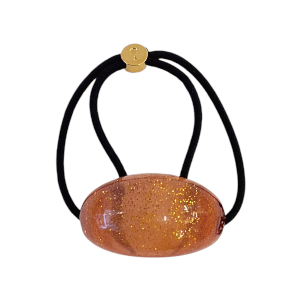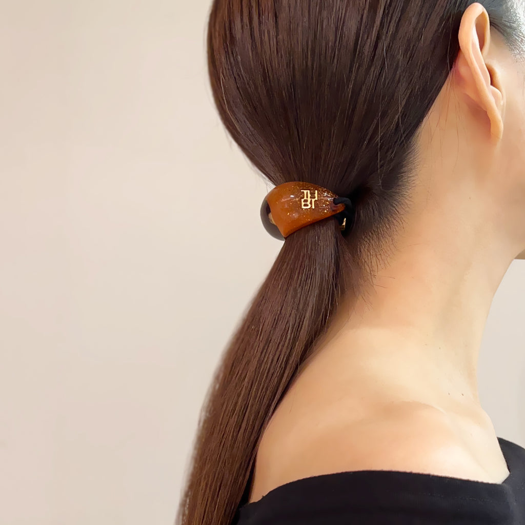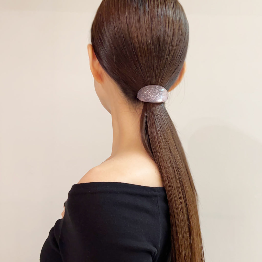 THBTオリジナルの新型ルーサイトポニー。オーバル型のオーナメントがリングのようにすっぽりと毛束をくるみ、まるでヘアゴムとは思えない優美なシルエットに。内側には大粒のグリッターがペイントされ、透明なアクリルを通してダイヤモンドダストのような幻想的なきらめきをお楽しみいただけます。サイドにはTHBTのメタルエンブレムを埋め込み、さりげなく上質感をプラス。サラリと着けるだけで何気ない日常のスタイルがぐっとあか抜けて見え、手元に置いておけばワードローブを格上げするアイテムになること間違いなし。ボリュームの割に軽量で着けやすく、幅広い髪質の方にお使いいただけるのもポイント。ギフトにもおすすめです。
