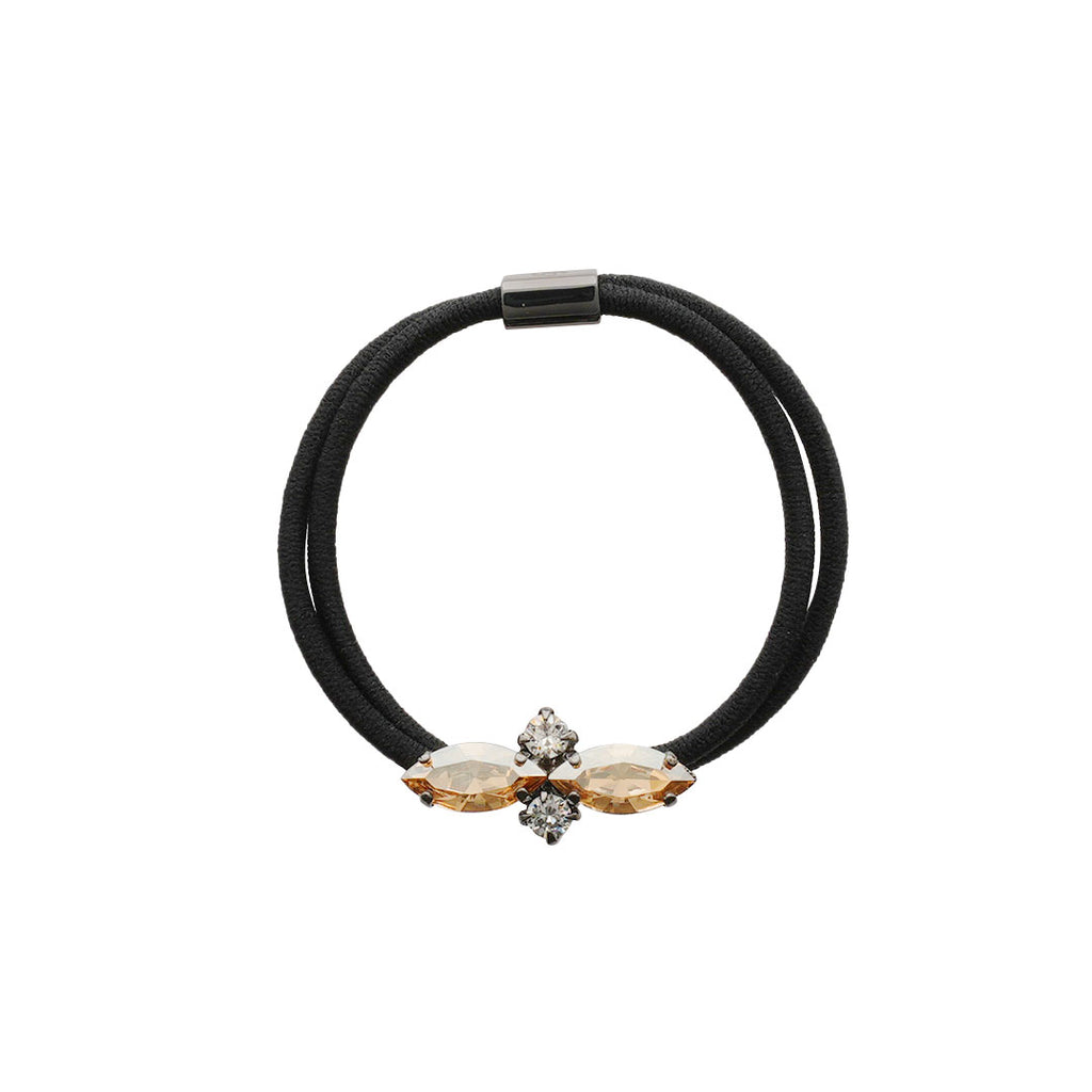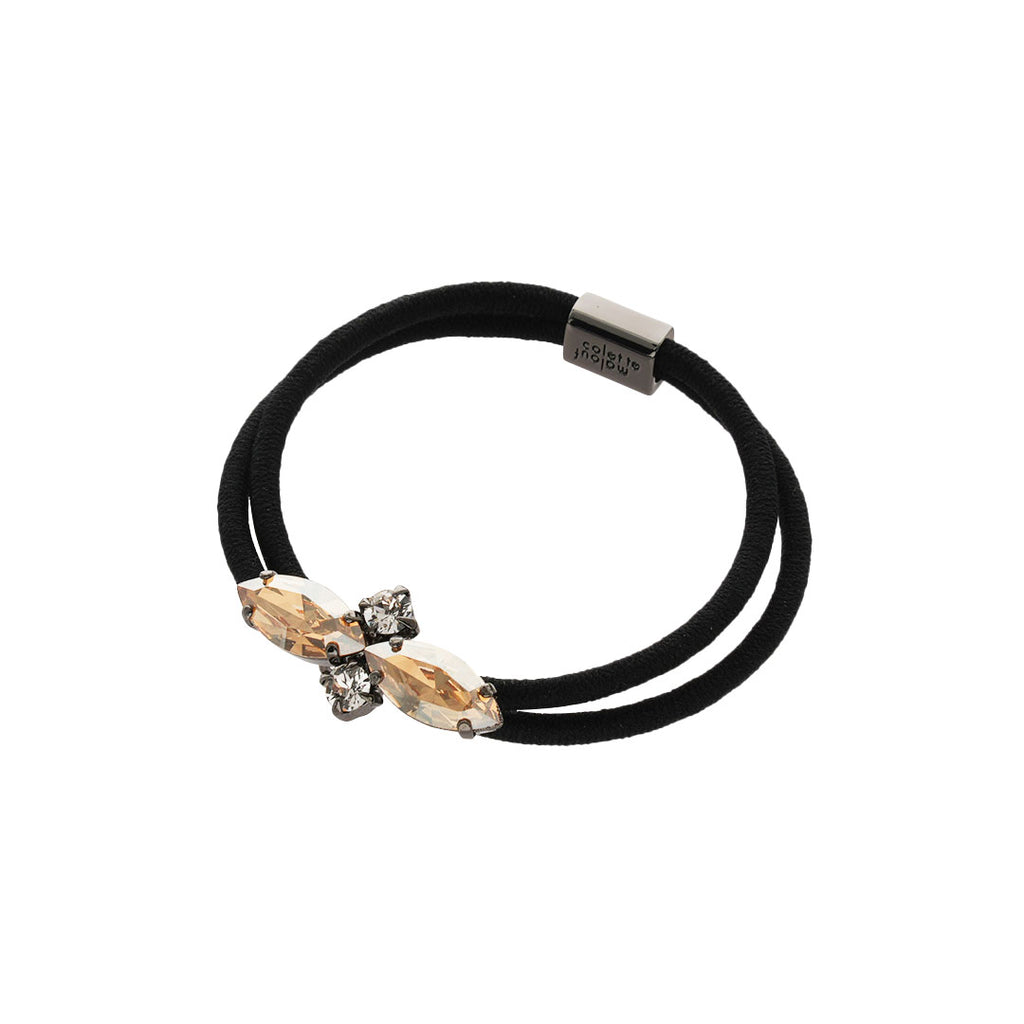 コレットマルーフのシンプルなビジューポニー。小さなクロス型のモチーフは甘すぎず上品な存在感です。2色展開のうち、グレーにはパール、シャンパンにはラウンドカットのクリスタルを組み合わせ、さりげない輝きは小さいながらも髪に着けるジュエリーのよう。軽量で着けやすく、髪質を選ばないデザインはちょっとしたギフトにも最適。ブレスレット感覚で手首に着けるのもおすすめです。