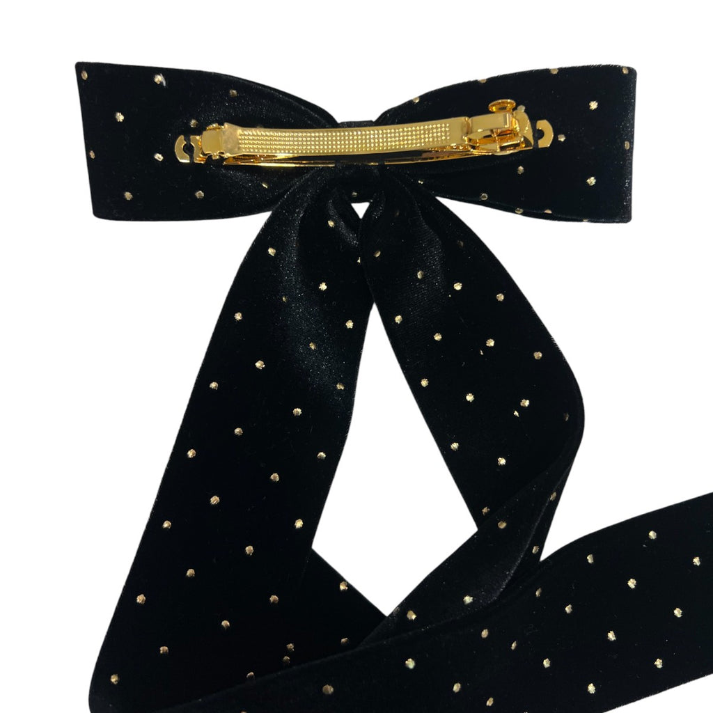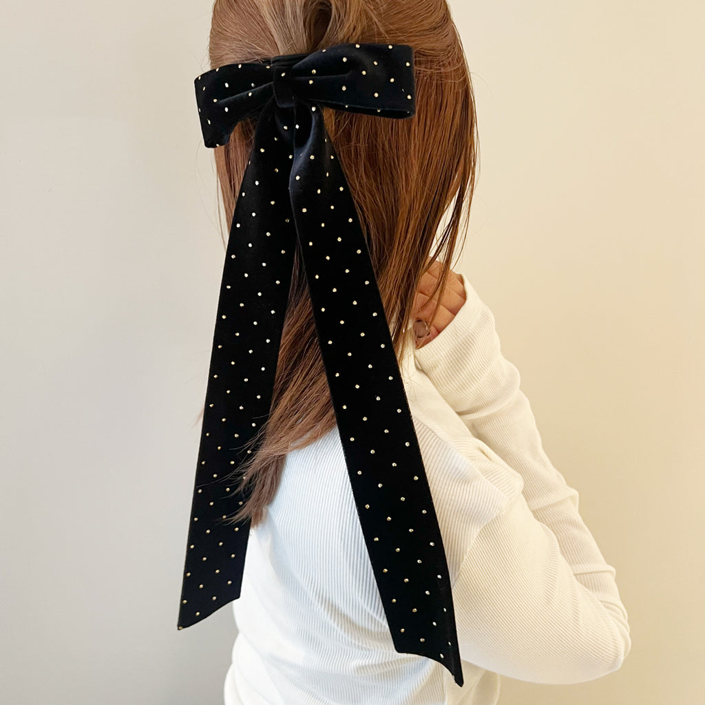 THE HAIR BAR TOKYOオリジナル、ゴールドのドットが最高にキュートなロングボウバレッタ。なめらかなベルベット生地の両面にゴールドの小さなドットがちりばめられ、リボンが揺れるたびにキラキラときらめきます。生地はダブルフェイスで裏表どちらにもドットが施され、リュクスな輝きを楽しめます。