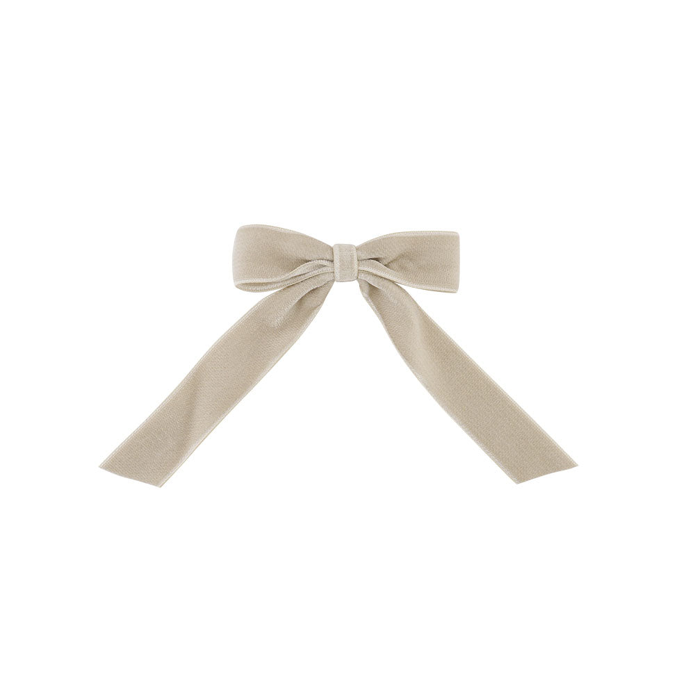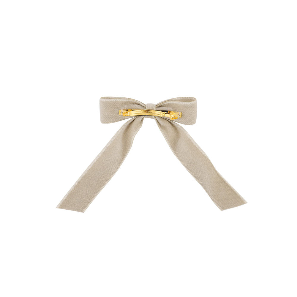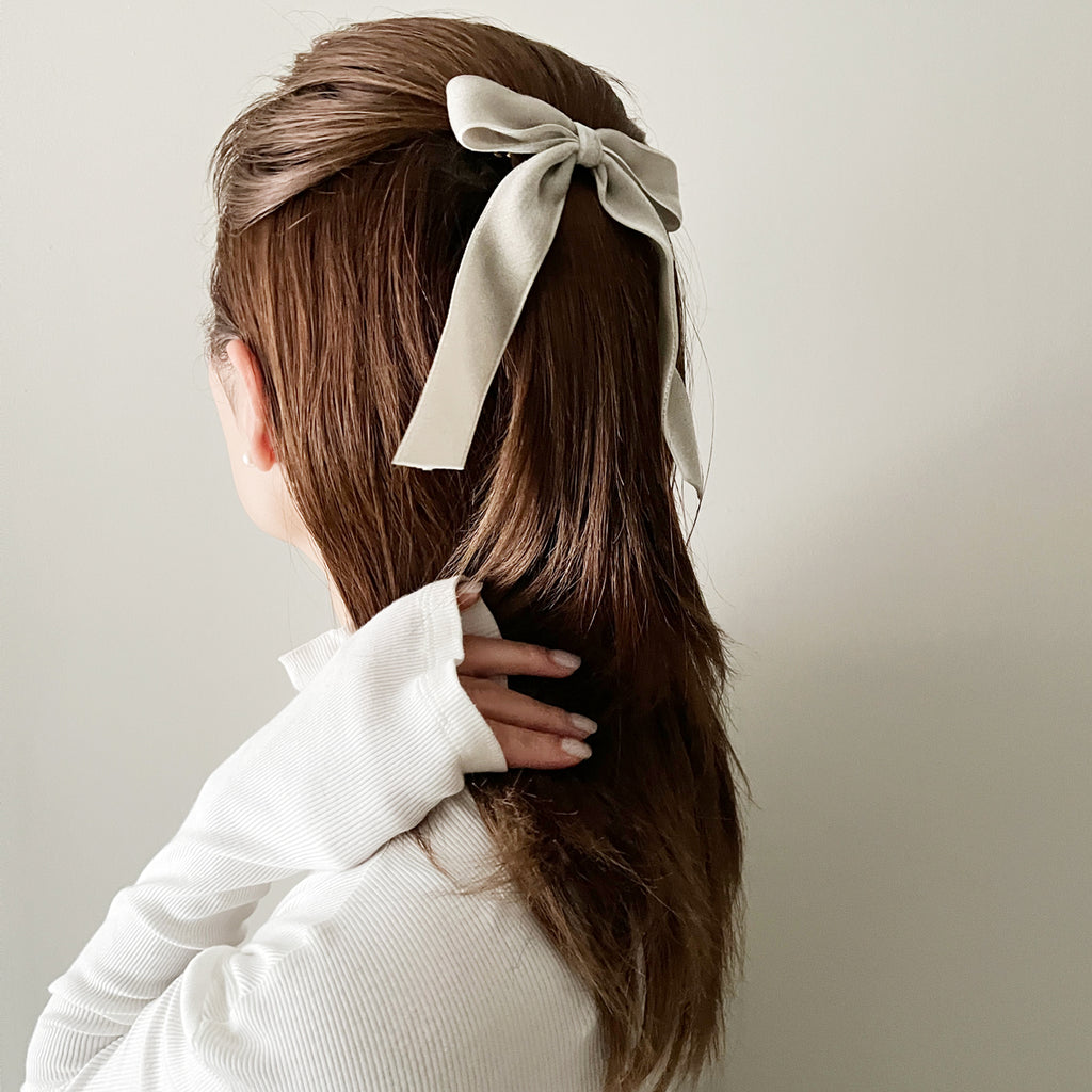 THE HAIR BAR TOKYOのベルベットボウ6cmバレッタSサイズ。ダブルフェースの上質なベルベットを贅沢に使用し、端正な細身のシルエットが特徴。ハラリと流れ落ちるようなテールが髪の動きに合わせて揺れ、上品かつフェミニンな仕上がりに。薄手の6cm金具は髪に着けるとすっきりと見え、柔らかめ・細めの髪質の方に最適。毛量によっては無地のポニーで結んだ上に留めるスタイルがおすすめです。