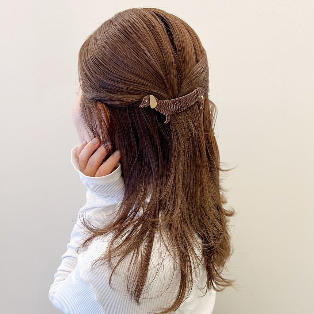 タートルストーリーの持ち味である遊び心がたっぷりと詰まったダックスモチーフのバレッタ。ヨーロッパブランドらしいレトロポップな造形や、綾のような柄が入ったクラフト感覚のテクスチャーが魅力です。薄手で小さめの金具は前髪やサイドを留めるほか、シニヨンやポニーテールにアクセントとして添えてもOK。笑顔を誘うキュートなデザインはギフトとしてもおすすめです。