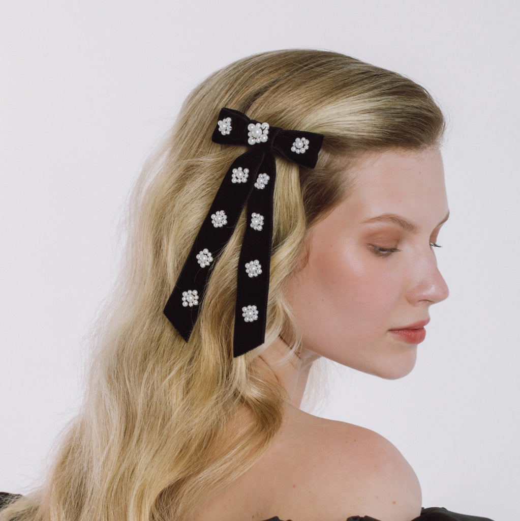 ジェニファーベアのロマンティックなベルベットバレッタ。ハンドメイドで丁寧に作られたリボンにパール刺繍を施し、漆黒のベルベットとパールの柔らかな輝きのコントラストはジェニファーベアらしいネオクラシックな魅力にあふれています。